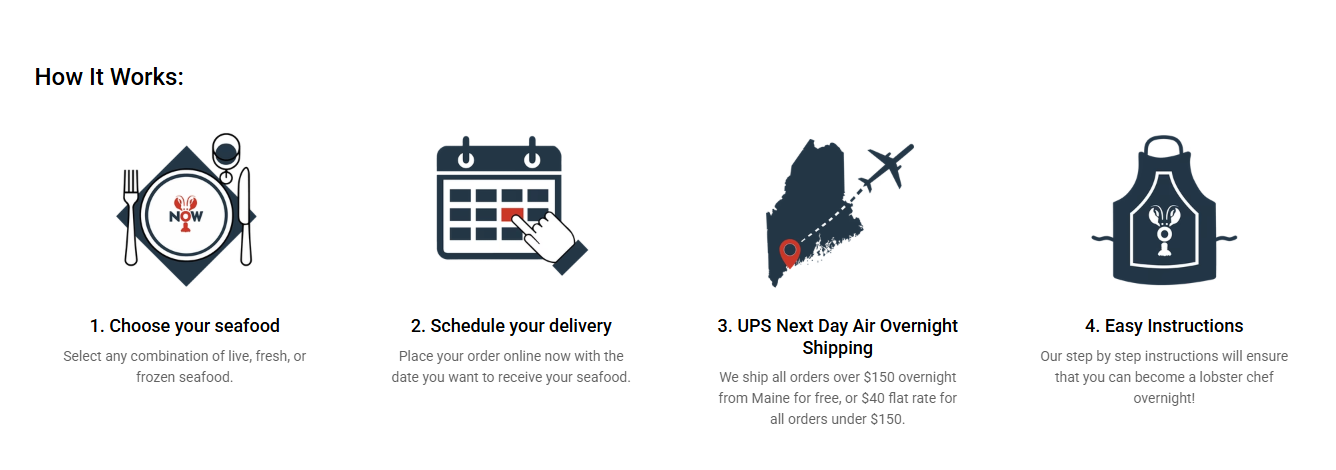 We offer a simple way to buy lobsters. Just select the number of lobsters you want, and we do the rest. Buy lobster anytime, day or night. We deliver lobsters exclusively for a variety of restaurants in southern Maine.